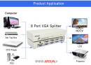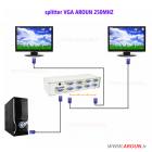 از طریق این اسپلیتر می توان 1 ورودی تصویر را از یک منبع پورت VGA مانند ( لب تاپ، کیس کامپیوتر، و ...) به 8 نمایشگر یا مانیتور بدون کاهش کیفیت و سایه داشتن تصویر به طور همزمان به 8 خروجی متصل کرد. اسپلیتر 8 کانال VGA AROUN 250 را می توان در سالن های همایش و کنفرانس و ... استفاده کرد به گونه ای که شخصی که قرار است پرزنت کند با متصل کردن کابل VGA خود به این اسپلیتر تصویر لب تاپ خود را بر روی نمایشگرها و تلویزیون های که بر روی میزها و دیوارها نصب شده است انتقال می دهد و کلیه افرادی که در آن جلسه هستند می توانند آن تصاویر را مشاهده کنند و برای ارایه مطالب مثل آمار ها و نمودار ها و پاور پوینت های آموزشی مورد استفاده قرار میگرد.